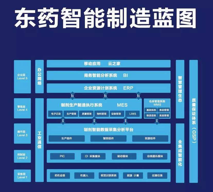 再就是上面搭的制造執(zhí)行系統(tǒng),包括電子批錄、生產(chǎn)管理、配方、過程質(zhì)量管理、物料管理等。這里面重要的部分就是把藥品的電子記錄部分優(yōu)先做出來,因?yàn)樗欠螱MP合規(guī)性重要的一部分。當(dāng)然還有實(shí)驗(yàn)室管理系統(tǒng),這次智能改造的時候,我們會把倉庫完全變成智能倉庫,和數(shù)據(jù)打通。