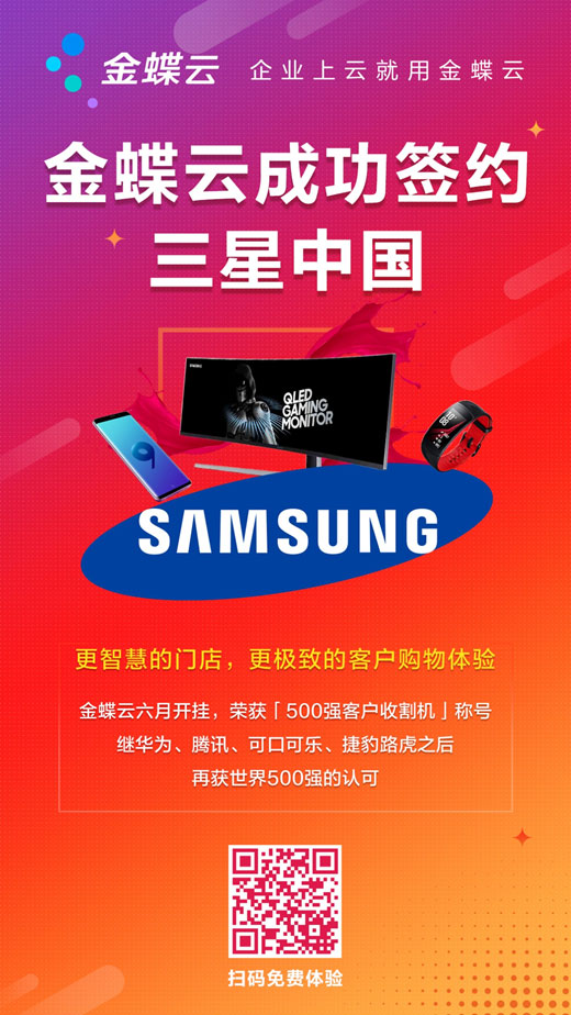 7.4日訊,恭賀金蝶云簽約三星中國。近日,三星中國正式上線金蝶云全渠道營銷系統(tǒng),金蝶云將幫助三星管理上千價(jià)零售門店,這也是繼華為、騰訊、OPPO、阿里、海爾之后,金蝶云簽約的又一世界級(jí)名企。